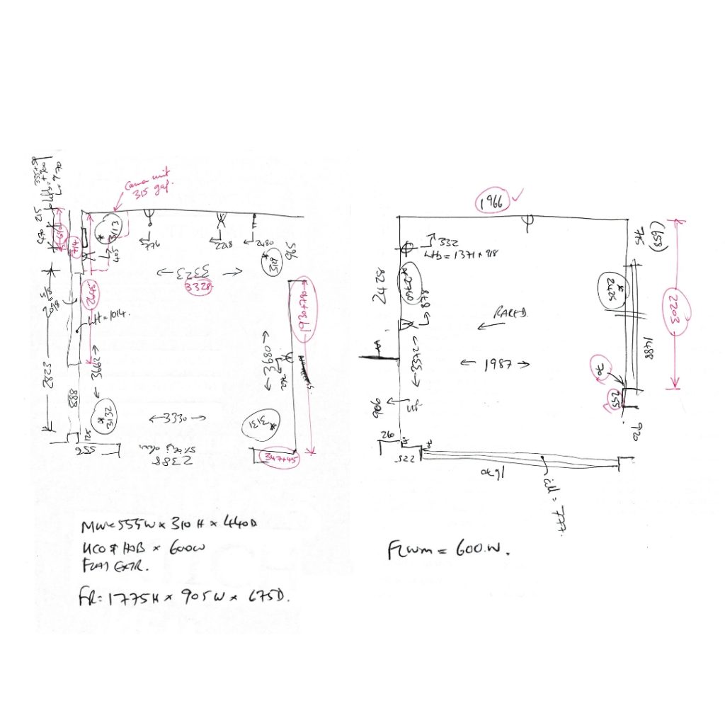 Don’t include existing cupboards as we will be redesigning your kitchen for you from the ground up. Once you have sketched out your kitchen you can start measuring.